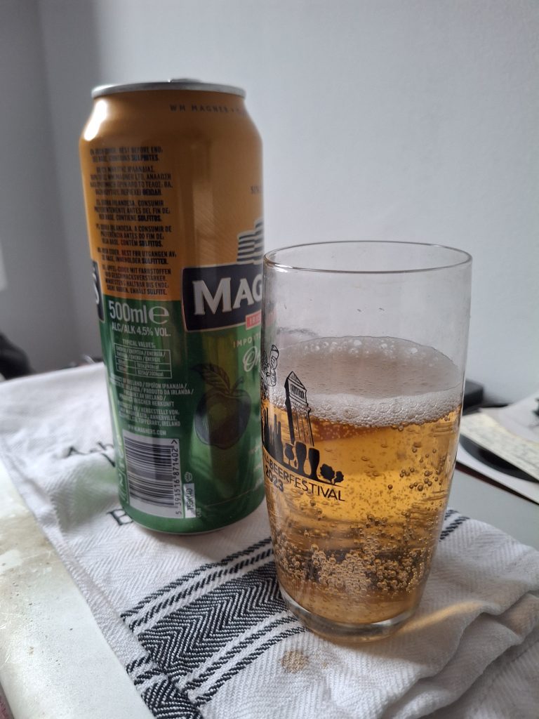 Interesting rosy, rusy gold color. A little champagney maybe. Bubbly, not no lasting head. It has that tangy sour smell that you can expect from a cider, with a touch of sweetness to it. It is very sweet and appley compared to other, more crafty, ciders, and more like apple juice than even American cider. Despite the initial bubbles I find it very smooth and easy to drink, hence the juice comparison. It has a good level of flavor, not overbearing and with a clean finish, no weird aftertaste at all. It also has a smooth texture that doesn’t quite jive with the bubbliness in the beginning, but it’s very pleasant and an encouraging drink. These characteristics could very well make Magners a danger, since you could take down pint after pint in an evening without even thinking. It isn’t a sneaky pastry stout or NEIPA, but it is at the same level of alcohol as a normal everyday beer, so that will catch up to you eventually. I think I will be satisfied with the one, just for the occasion.