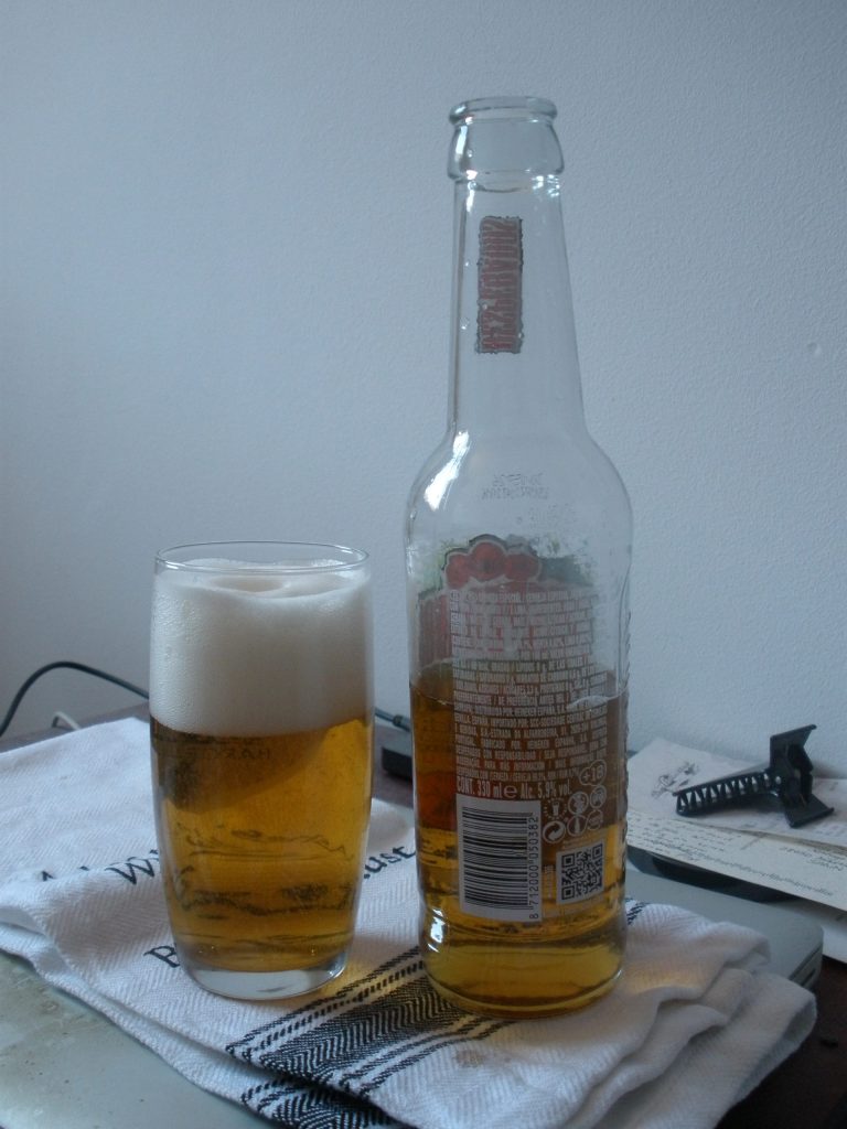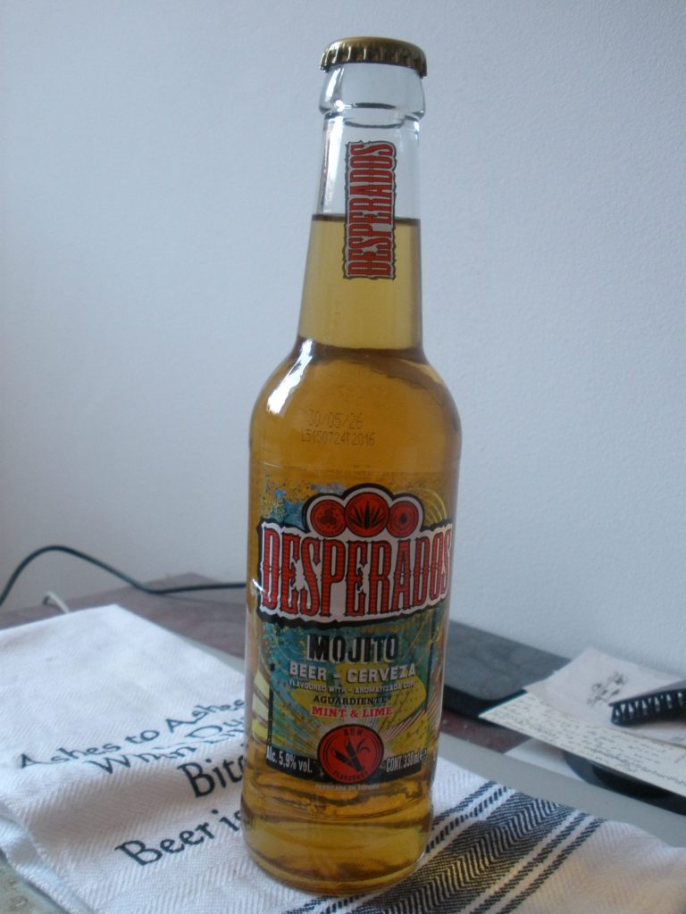 My beer-giving friend has another gift for me: Desperados! I think I’ve had another of their products some years ago, a mix of beer and tequila. It was … fine. I’m not a big fan of tequila, or light lagers, but as something different, it is something different. This is not a tequila beer, however, this is a mojito beer! It announces rum as one of its flavorings, although at less than 6% it might not have any contact with actual rum. It also promises mint and lime aromas, if not flavors, which sounds right for the recipe.